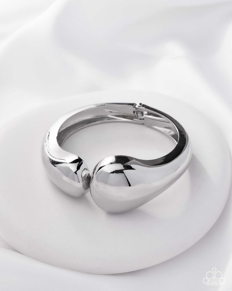 Featuring mismatched, oversized teardrop-shaped ends, a glistening, smooth, silver cuff meets at the center of the wrist, creating a bold, modern look. Features a hinged closure.
