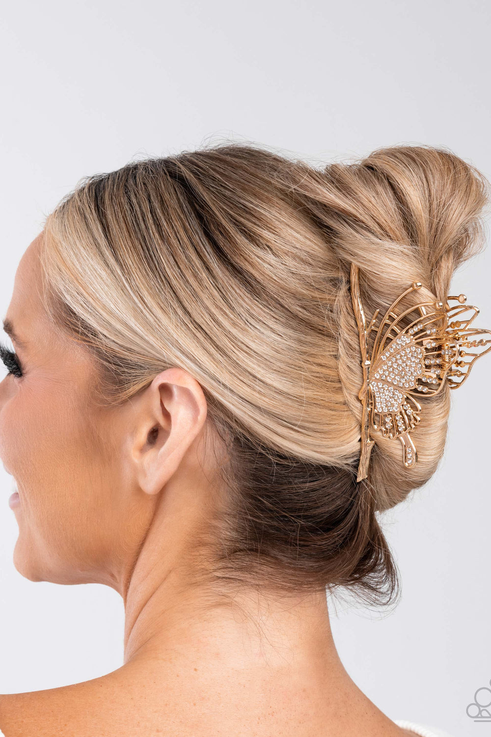 Dusted in white rhinestones, this intricately detailed gold butterfly claw clip holds the hair away from the face for an on-the-go, whimsical display. Clip measures approximately 2" in length and 4" in width.